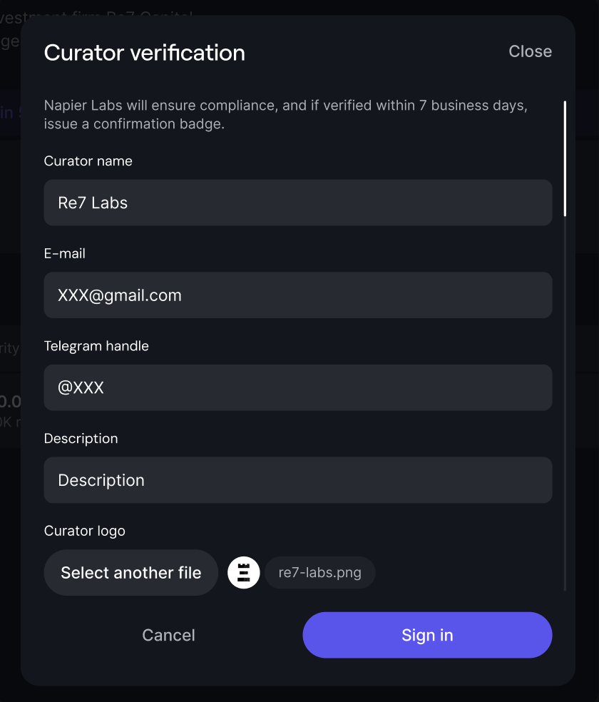 Becoming a **verified curator** increases the visibility of your markets in the Napier interface.